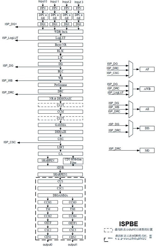 先看海思,海思的芯片实力很强,一般做的是集成ISP。从麒麟950开始,海思的SoC芯片中开始集成自研的ISP模块。以Hi3559A为例,我们可以看一下其ISP整体的结构。