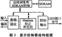 控制器的架构与数据分发类似,也采用二级存储模式,主要有数据接收、Gamma校正和交织、扫描控制输出以及总线调度和SDRAM控制四部分。
