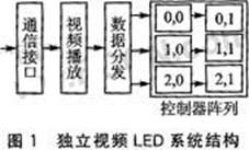 独立视频LED系统完全脱离计算机的控制,本身可以实现通信、视频播放、数据分发、扫描控制等功能。为了实现大屏幕、全彩色、高场频,本系统采用控制器阵列模式,如图1所示。