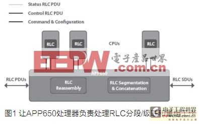 在CPU资源库中,RLC层的SDU与RLCPDU分段/级联会消耗大部分CPU资源。由于分段/级联以及重组能以高数据速率在所有RLC通道上执行,因此可将CPU从上述工作中释放出来,从而显著节约CPU资源。图4显示了RLC发送器的不同组件以及加速引擎和CPU集之间的分区。我们的目标就是将CPU从高带宽工作中释放出来。