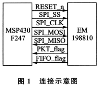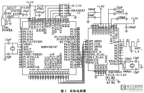 图1是MSP430F247单片机和EMl98810的连接示意图,通过SPI总线与RF芯片相连。实际电路连接如图2所示。