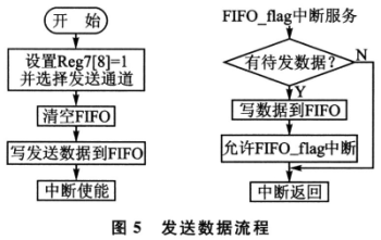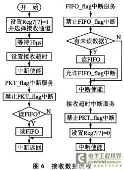 发送数据流程如图5所示。在发射数据时,先设置Reg7的第8位为1,允许在内部状态机控制下进入数据发射状态,再设置Reg7的O~6位为所选通道。在发送前导尾区数据前,MSP430F247必须将数据放人FIFO中,如果数据长度超过63字节,应该分多次写入。FIFO_flag=1表示FIFO为空,MSP430F247利用此信号作为中断请求,保证发送数据写入FIF0的实时性,在数据发送完成后PKT_flag=1。