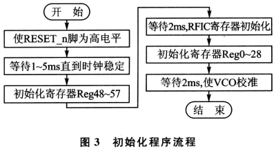 系统上电后,先使EMl98810的RESET_n引脚为低电平,以保证芯片有效复位;再使此引脚为高电平,BRCLK脚会产生12 MHz的时钟;然后进行相关寄存器初始化。初始化程序流程如图3所示。