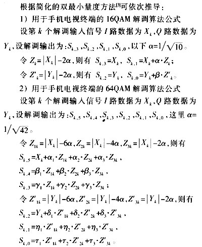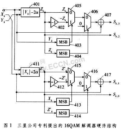 三星公司提出的QAM解调器方案体现在其一项名为"Demodulation apparatus and method in a communieation system employing 16-ary QAM"的专利中。此专利提出了简化的双最小量度方法,使得16QAM解调器可用双最小量度过程简化信道译码输入软信息的获得,而无须通过映射表或其他复杂过程来得到接收信号的最小距离值,硬件实现比较简单。