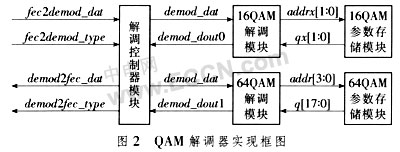 由图2中的解调控制器模块接收到调制数据fec2demod_data,对调制类型fec2demod_type进行分析判断后,把凋制数据demod_data分别送到16QAM解调模块或64QAM解凋模块:进行16QAM解调时,16QAM解调模块把地址addrx送给16QAM参数存储单元,并渎取解调参数qx进行处理,16QAM解调模块将解调后的数据demod_dout0送给解调控制器模块;进行64QAM解凋时与此类似,但解调参数为q,解调后的数据为demod_dout1。解凋完成后解倜控制器模块将解调数据demod2fec_data及调制类型demod2fec_type送给下一级译码模块。