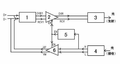 (通过控制端EN来控制逻辑“通”与“端”。当EN=“0”时,DOR=DOR1、RCV=RCV1。而当EN=“1”时,DOR和RCV为高阻状态。光发射驱动电路(3)将DOR和RCV转换为三种光强度(亮、半亮、暗)。光接收电路(4)将接收到的三种光强度(亮、半亮、暗)恢复为D+和D—的三种状态。光接收电路(4)的输出之一H的状态变化触发单稳延时电路(5)。单稳延时电路(5)的输出EN平时(即USB信号处于闲置状态时)为“0”,当其输入H 有下降延(即由“1”变为“0”)时输出EN由“0”变为“1”并且保持为“1”大约1000us,然后恢复为“0”。另一双可控三态缓冲器(2)通过控制端EN来控制来控制逻辑“通”与“断”,当EN=“1”时,VP=H、VM=L,而当EN=“0”时输出VP、VM为高阻状态。