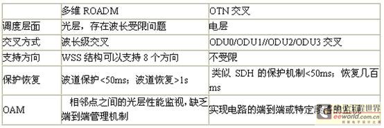 OTN和多维ROADM都是适用于大颗粒业务调度的传送网技术,两种技术的比较见表1。