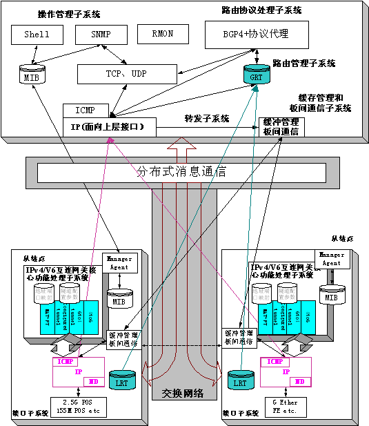 安全网关主要包括支撑子系统,路由协议处理子系统(主要是BGP4+代理),IPv4/IPv6互连网关核心功能处理子系统、IP转发子系统(分布式结构),操作管理子系统等等。图1-4给出了在该体系结构下,IP分组流动的示意图。