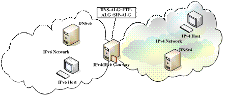 DNS应用层网关部分是为了支持DNS的IPv6扩展功能的。它主要对针对目的端口/源端口=53的DNS_UDP报文进行翻译的。DNS应用层网关的主要功能是支持外部的IPv4主机对IPv6域内服务器的访问。这样,当外部的DNSv4的查询报文通过路由器的时候,将被翻译后送到IPv6域内的IPv6 DNS服务器。同样IPv6域内的IPv6 DNS服务器的DNSv6回复报文,也将被翻译后返回给原IPv4主机。