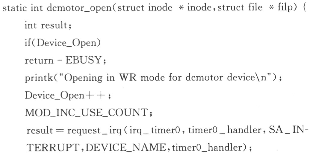 设备打开的时候就会调用dcmotor__open函数进行申请中断号。带内存管理的单元的地址映射,设置B端口的2、3引脚为PWM输出,端口D配置为电机使能刹车制动引脚。