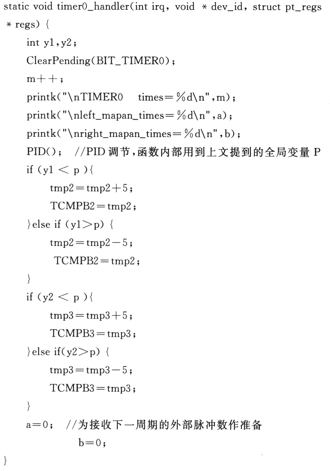 timer0中断是核心程序,它可根据PID的调节值来改变占空比。为了便于随时改变占空比的值可定义两个全局变量tmp2、tmp3,通过把它们的值写入TCMPB来改变占空比。