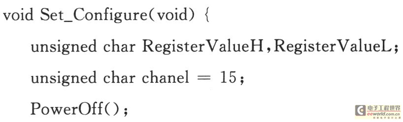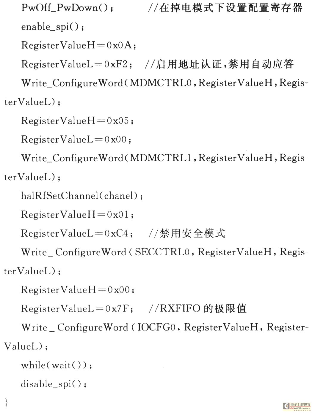 在使用CC2420进行无线数据传输之前,必须根据需要进行一些配置。使能SPI后,由微控制器发送命令给CC2420,这些命令通过模拟的SPI接口传送到CC2420。通过这种方式,用户可根据需要来配置寄存器的值,选择是否使用地址认证、安全认证等功能,同时还需要设置好发送和接收的频道。在2.4 GHz下提供有16个可选频道,初始化程序如下: