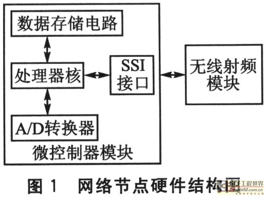 无线传感器网络由网络中的多个网络节点构成。用模块化的设计方法,节点的硬件由微控制器模块和无线射频模块组成。其中,微控制器模块包含处理器核、数据存储电路和A/D转换器等,根据不同的需求还可以连接其他传感器模块。网络节点硬件结构如图1所示。