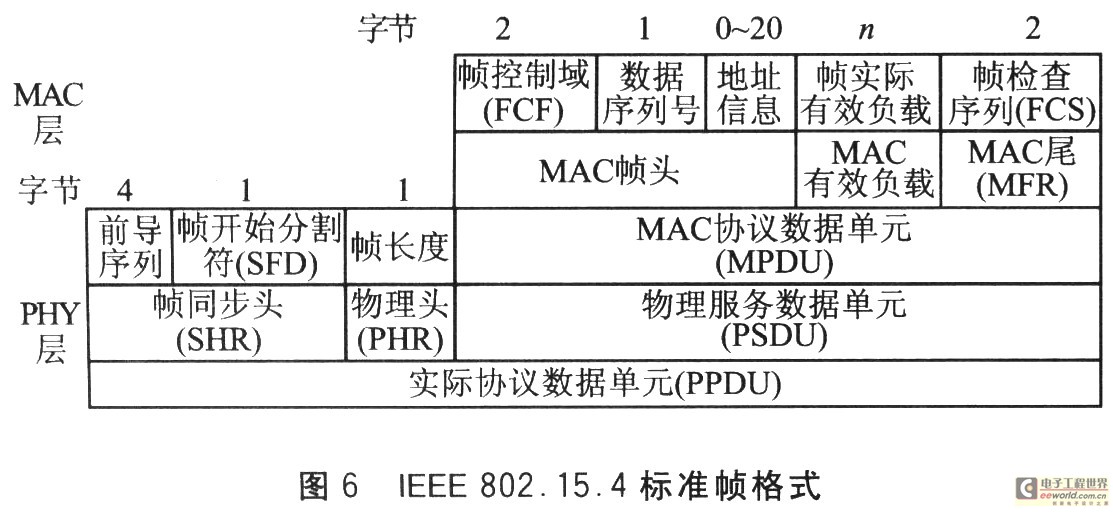 从程序流程中可以看出,发送端和接收端都需要先初始化引脚和芯片,等待CC2420晶振起振后,根据程序的需要来进行寄存器的配置。发送端,需要先通过微控制器的SPI接口把需要传送的数据发送到CC2420的TXFIFO中缓存起来,这需要根据自定义或IEEE 802.15.4定义的帧格式来发送,缓存好数据后就可以启动发送了。本设计采用IEEE标准的帧格式,在帧结构中Preamble Se-quence、SFD以及FCS在发送时由硬件自动生成。其帧格式如图6所示。