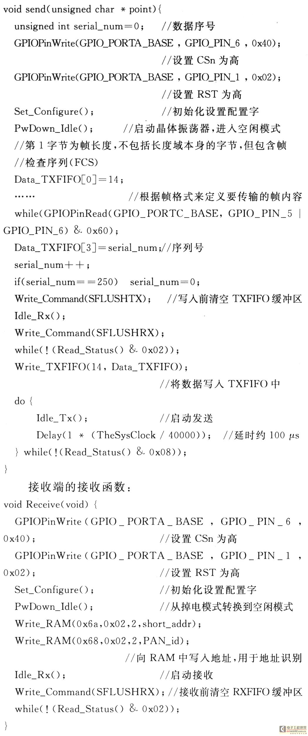 接收端在初始化和配置寄存器等准备就绪后就可以启动接收。当接收端检测到发送的帧中的帧开始分割符SFD后开始接收,接收的数据存放在RXFIFO缓存中。发送端的发送函数: