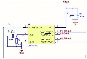 LM1881可以从0.5~2V的标准负极性NTSC制、PAL制、SECAM制视频信号中提取复合同步场同步、奇偶场识别等信号,这些信号都是图像数字采集所需要的同步信号,有了它们,便可确定采集点在哪一场,哪一行。LM1881也能对非标准的视频信号进行同步分离,通过固定的时间延迟产生默认的输出作为场同步输出。