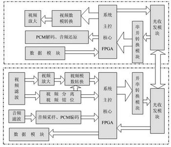 整个系统由核心控制模块FPGA、音频采样编解码模块、视频分离模块、视频放大模块、视频A/D和D/A转换模块、并串/串并转换模块、光纤调制收发模块、电源控制模块和485数据传输模块。图1是该系统的系统框图。