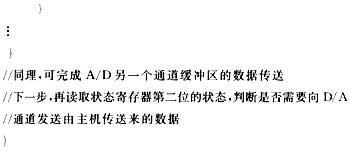 FPGA采用Altera公司的Cyclone 芯片EP1C6Q240C8。在这里FPGA的作用有3个:其一,给两路D/A转通道各分配两个128×8位的RAM区,作为从主机向外设发送数据的缓存。其二、给两路A/D转换通道各分配两个512×8位的RAM区,作为从外设向主机传送数据的缓存,由于两路数据的传输和采集共用一个8位数据总线,因此,数据总线要针对不同的接收和发送来回切换,因而每个通道的两路分别采用两个RAM块,起到双缓冲作为,以防传输时数据"溢出"的。其三,由于数据总线要针对不同通道来回切换,控制切换的过程由状态寄存器来完成,因此,要在FPGA内部设置一个状态寄存器,所设置的状态寄存器仅包含两位,分别标识两个通道的数据RAM的"满"或"空"的状态,以确定当前应该为哪一个通道发送或接收数据。