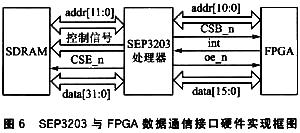 数据经FPGA做算法处理后,由SEP3203处理器将结果存储到片外SDRAM中,SDRAM使用的是Winbond公司的W981216BH。硬件实现框图如图6所示。