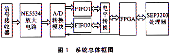 系统硬件主要由信号采集模块、FIFO、FPGA和SEP3203处理器组成。信号采集模块主要包括信号接收器和A/D转换模块。接收到的信号首先要通过NE5534进行放大,NE5534采用±5 V供电。图1为系统总体框图。