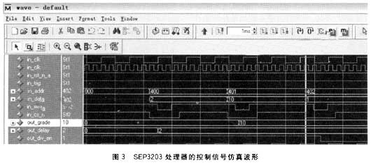 SEP3203对FPGA的访问遵循SRAM时序,图7为SEP3203读数据时的信号仿真波形图。