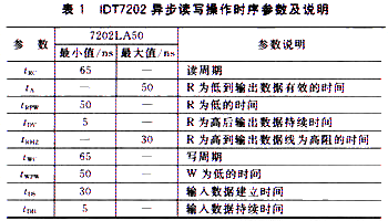 表1是IDT7202异步读写操作时序的参数及说明。
