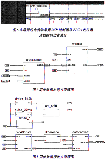 根据以上对同步485实现方法的描述,在ISE中利用ECS工具所描绘的顶层原理图如图7和图8所示。包括测速定位单元同步数据发送和车载无线电控制单元同步数据接收两部分。