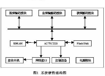 具体的系统实现方案是采用三片DSP作为音视频的协处理器:一片TMS320C5402" title="TMS320C5402">TMS320C5402(以下简称为TMS5402)实现音频编解码,一片TMS320C6204" title="TMS320C6204">TMS320C6204(以下简称为TMS6204)实现视频编码,另一片TMS6204实现视频的解码。为了实现对系统的控制,同时扩展其网络功能,另外采用了一片ATMEL公司的AT75C220" title="AT75C220">AT75C220芯片,通过在其上嵌入式操作系统,来实现对DSP芯片及其外围电路的控制。具体的系统硬件结构图如下图1所示:
