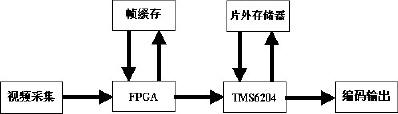 视频编码工作过程:视频图像经过采集存储于帧缓存器中,采集完成后FPGA(可编程逻辑器件)向TMS6204发出接收信号。TMS6204接收到“图像已采集好”的信号后,就通过DMA方式将图像写至片外存储器SDRAM中,并开始运行MPEG-4视频编码算法对片外存储器中的图像进行编码。编码输出信号通过HPI(Host Port Interface)口送至AT75C220,AT75C220将视频信号与音频进行同步打包后经由网络模块发往接收主机处。