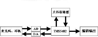 音频编码的过程与视频类似,不同的是由TMS5402来执行编码算法,这主要是考虑到系统的性价比。由于音频编码的运算量要比视频编码小得多,这使得TMS5402的芯片资源足够完成音频编码,并且其价格要比TMS6204低的多。
