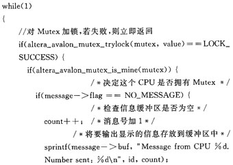 软件使用硬件Mutex共享一个消息缓存区。3个处理器分别写消息到消息缓存区(count)且循环加1。cpul读消息且通过jtag_uart显示消息。每个处理器运行同样的C文件,但处理器的操作稍有不同。这是通过使用Ni-osII的cpuid实现的。在NioslI处理器系统中,某个处理器通过写其cpuid控制寄存器的值到Mutex寄存器的OWNER域来对Mutex加锁。cpuid寄存器保持一个静态值,在多处理器系统中,该值唯一地识别一个处理器,且在系统创建时确定。软件执行某个处理器的函数时,首先检查处理器的cpuid,如果cpuid正确,则执行相应函数。工程中的文件为hello_world_multi.c,其中将信息写入缓冲区的功能由以下程序段实现:
