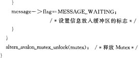 NiosII处理器允许使用其硬件互斥核部件对共享资源进行保护处理。这个硬件互斥核不是一个NioslI处理器内部的部件,而是一个称为Mutex的SOPC Builder组件。