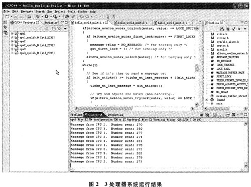 在NiosII IDE[3]环境下,为3个处理器系统分别创建6个软件工程,为每个处理器创建一个应用工程和一个系统库工程。之后对软件工程进行编译、运行和调试。