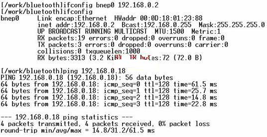5、实验结果:由图2和图3可以看到在运行了包含hcid、sdpd、hciconfig、hcitool四个进程的文件bluetooth后,可看到S3C2410一侧的USB蓝牙的地址为00:0D:18:01:23:88,而后用ifconfig bnep0 192.168.0.2修改了它的局域网地址,最后用ping 192.168.0.18(PC机上的蓝牙地址)即可实现双方的数据收发。