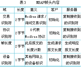 Modbus-TCP实现了在TCP/IP以太网上以客户/服务器方式的Modbus报文通信。这种通信模型是将Modbus协议作为应用层协议嵌入到低层TCP/IP协议中构成的。与标准Modbus帧相比,Modbus-TCP帧中的寻址与校验交由TCP/IP协议完成。如图3所示,使用封装的方法将Modbus PDU嵌入到TCP报文中形成Modbus-TCP帧,该帧在PDU之前形成了一个占用7个字节大小的MBAP帧头,帧头可以划分为四部分,如表3所示。
