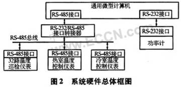 由于从机部分的仪表较多,并且通信协议和通信接口不一致,故系统采用多串口通信。功率计为RS-232接口,故单独为其分配一个串口;32路温度巡检仪和两个温度控制仪为RS-485接口,而PC一般只有RS-232接口,需要RS-232/RS-485接口转换器。系统的总体硬件框图如图2所示。巡检仪按国家标准外接的温度传感器采用铜一康铜热电偶,要求的温度测点很多,所以同类温度测点的热电偶可以并联。具体装置尺寸及材质、热箱外壁和试件框热流系数标定、试件框的面积划分、温度测点的分布、热电偶的筛选和校验等详细要求请参见有关国家标准。