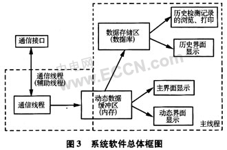 系统软件总体框图如图3所示。它充分利用了Windows系统允许多进程、多线程的编程特点,开辟了两个线程;还利用了VC++的面向对象的设计思想,把有关的数据结构及其操作完全封装类中。系统主要实现的功能有下位机数据采集、主界面显示、实时曲线显示、数据存储、历史曲线显示、检测结果测定、检测报告和历史报告记录的浏览及打印、数据库清理及维护等。