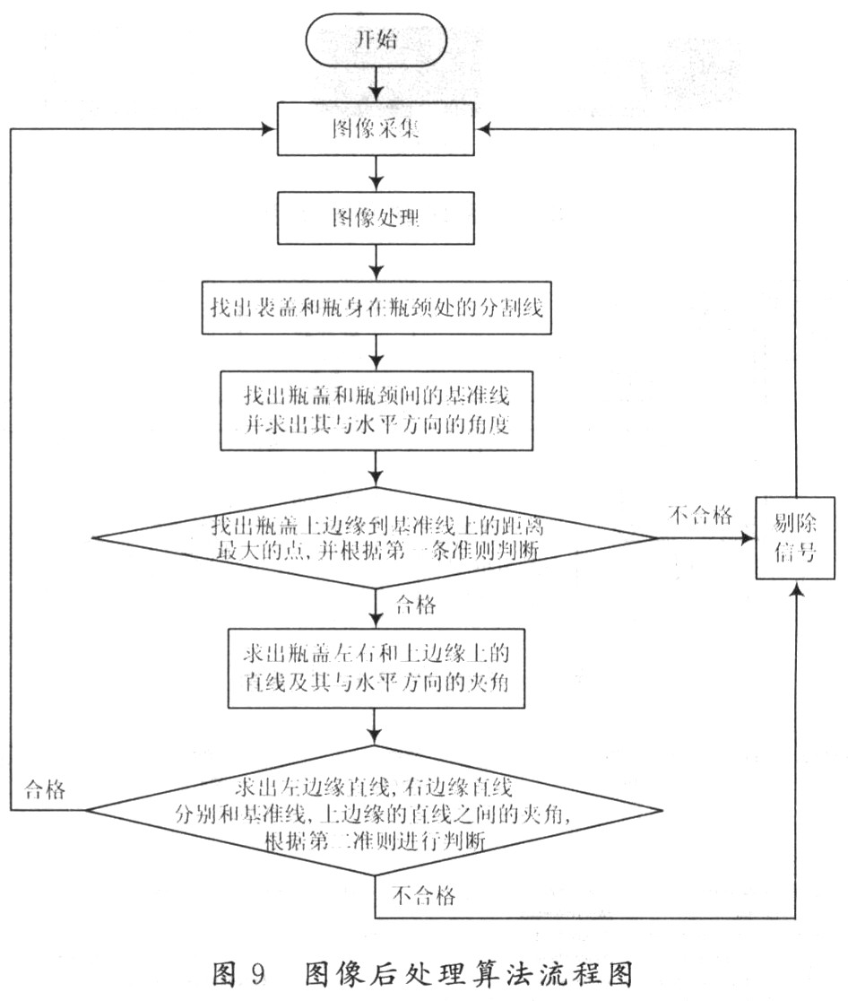 (5)利用已求出的4条直线与水平方向的夹角,可以求出左边缘确定的直线(右边缘确定的直线)与基准线之间的夹角;左边缘确定的直线(右边缘确定的直线)与上边缘确定的直线之间的夹角一共有4个角,然后根据第二条判断准则判断瓶子是否合格,流程图如图9所示。