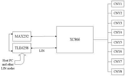 当反光板反射式光电开关CNY70检测到给定的白色(或黑色)路线时,产生相应的电平信号,经XC866采集再通过LIN总线传送给主控制器。
