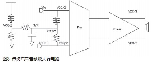 图3为传统汽车音频放大器电路的简单结构。从图中可以看出,该放大器在工作时输入和输出都被偏置VCC/2。这种结构在电池快速掉电的过程中,电路的 SVR处必须有个快速放电过程。在快速放电的过程,电路是不能正常进行音频输出的。所以电路就进入了MUTE状态。比如电池短时间从12V到6V,如果不快速放电,那么SVR会在一定时间内保持VCC/2,即6V。这时候前级放大器Pre也都保持在6V电压状态下。显然电路是不能正常工作了。通常在进行音频放大器的设计过程中,7V一般为芯片的最低工作电压。所以在电源下降到6V时,芯片实际上已经自动关断了。