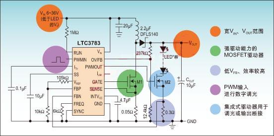 图:基于LTC3783的大功率PWM LED驱动电路 |