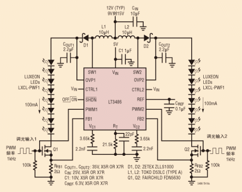 除了偏置电压,TFT-LCD显示器还需要背光照明以便观看。传统上,背光照明一直是采用CCFL实现的。但是,由于白光LED的尺寸更小,可靠性更高,因此在背光照明应用中迅速取代了CCFL。由于汽车内部光线变化和人眼对光强微小变化的敏感性,要求这些显示器的背光照明有高达1000:1的宽调光范围。凌特公司的 LT3486(参见图 4)可以解决这一问题。该器件是一种双输出降压型DC/DC转换器,专门设计成用12V输入电压驱动多达16个100mA的白光LED(每通道8个LED串联)。它用作恒定电流源,保持LED的亮度恒定,甚至每个LED的正向电压不同时也一样。LT3486是第一个采用“真正彩色 PWM(True Color PWM)调光”的LED驱动器,向LED提供了恒定电流,保持LED以恒定颜色发光。调光通过降低PWM驱动器的占空比控制。正像从图4中可以看到的那样,就大多数所需调光范围而言,该器件的效率在80%到90%之间。其耐热增强型TSSOP-16封装体积很小,热效率很高。