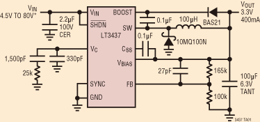 图3是LT3437的原理图和合成电源电流。该器件以4.5V至80V的输入电压可以维持3.3V的稳定输出电压,同时具有超过80%的效率。它采用有引线耐热增强型 TSSOP-16封装或3mm ×3mm 纤巧无引线 DFN 封装。这两种封装都具有非常高的热效率,θJC仅为10℃/W,无需任何外部散热器。LT3437 采用独特的突发模式设计,能够用仅为100uA的电源电流工作,非常适用于始终接通应用。LT3434和LT1976等类似器件也可用于电流较高的应用,如分别适用于输出电流为2.5A和1.25A的应用。