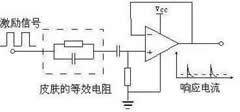 前面的实验结果表明,采用脉冲激励方式,可得到人体生物电阻抗的信息。根据皮肤水分测量对仪器在便携性方面的要求,设计了如图9所示的简化的脉冲检测电路。该简化方案使用单频脉冲信号激励,利用响应电流的峰值作为检测参量,实现对人体皮肤水分含量的测量
