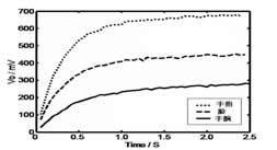 图中显示了在三个不同皮肤部位测量的响应曲线,测量的皮肤部位分别是:手指、脸、手腕。可以看出,响应电压不是马上就可以到达最大值,上升曲线的时间大概为1秒,而在2.5秒左右到达最后的稳定值。上升曲线的形状、快慢与电极接触皮肤的过程有关,曲线的最后稳定的最大值对于同一个检测皮肤部位一般不变;但是根据不同的皮肤,不同的皮肤湿润程度,这个最大值会相应的发生变化。这使得我们可以利用这个测量得到的响应曲线最大值作为被测皮肤的一个特征量作为研究,在误差允许的范围内,可以作为皮肤水分的一个指标。