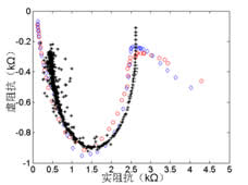 拟合的电阻抗谱图与实测的电阻抗谱图如图8所示,图中菱形点表示拟合的电阻抗谱图,圆点表示比对实验测得的人体皮肤电阻抗谱图,小星号线表示用脉冲式检测系统实测的人体皮肤电阻抗等效电路模型的电阻抗谱图。