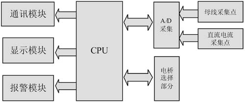 如图3所示,该设计大致可分为:采集部分、电桥选择部分、通讯部分、显示部分、报警部分,所有部分由CPU统一管理。首先,CPU根据不同方案选择不同的电桥,然后采集母线电压和霍尔电流传感器M点电压,将采集到的电压在CPU内进行处理,最终将处理后的信息通过通讯模块上传给主卡或上位机,且同时实时在显示模块上显示并根据上传数据进行实时报警。
