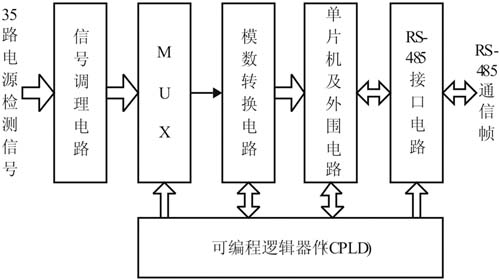 电源故障检测电路由硬件和软件两大部分组成,硬件组成框图如图1所示。信号调理电路对输入的35路电源检测信号进行滤波、分压及阻抗匹配,然后经过多路复用器(MUX)选择进入模数变换器(A/D),变换成数字量,单片机读入该数字量,与规定的上下限进行比较,判断该电压是否正确,最后生成单元级故障表,通过RS-485接口传送到上级进行进一步处理。