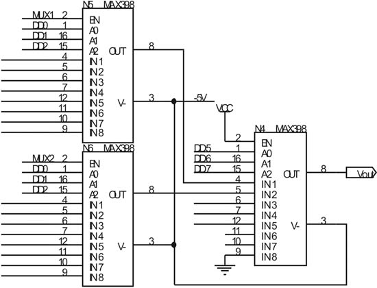信号MUX1~MUX5是MUX电路的前级芯片选择信号,高电平有效;DD0~DD2是MUX电路前级的通道选择信号,取值范围是0~34,对应模拟通道的1~35;DD5~DD7是MUX电路的后级通道选择信号,取值范围为0~4,分别对应前级的五个MUX的输出信号。这些信号的产生过程是:单片机通过数据线D0~D7将通道选择数据及芯片选择数据送到锁存器,产生通道选择信号DD0~DD2及DD5~DD7,再将部分数据进行译码产生MUX的片选信号MUX1~MUX5。
