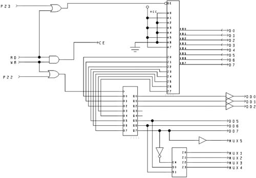 图6是CPLD内部逻辑电路,CPLD选用的是LATTICE公司的ispLSI1016E,逻辑设计采用原理图输入法,主要功能是对MUX的通道进行选择、对A/D转换器进行控制及产生自检代码等。图中有三个主要器件:数据双向开关、数据锁存器、译码器。数据双向开关的OE为低时,数据A0~A7传向单片机的数据线D0~D7,该数据正常时是自检代码AAH,当OE为高时,单片机数据传向CPLD内部的锁存器,用来对多路模拟开关进行选择。端口地址译码使用了单片机的RD、WR、P22、P23引脚,还使用了单片机的P20及P21引脚,它们分别连接到A/D转换器CS和CE端,具体地址定义如下: